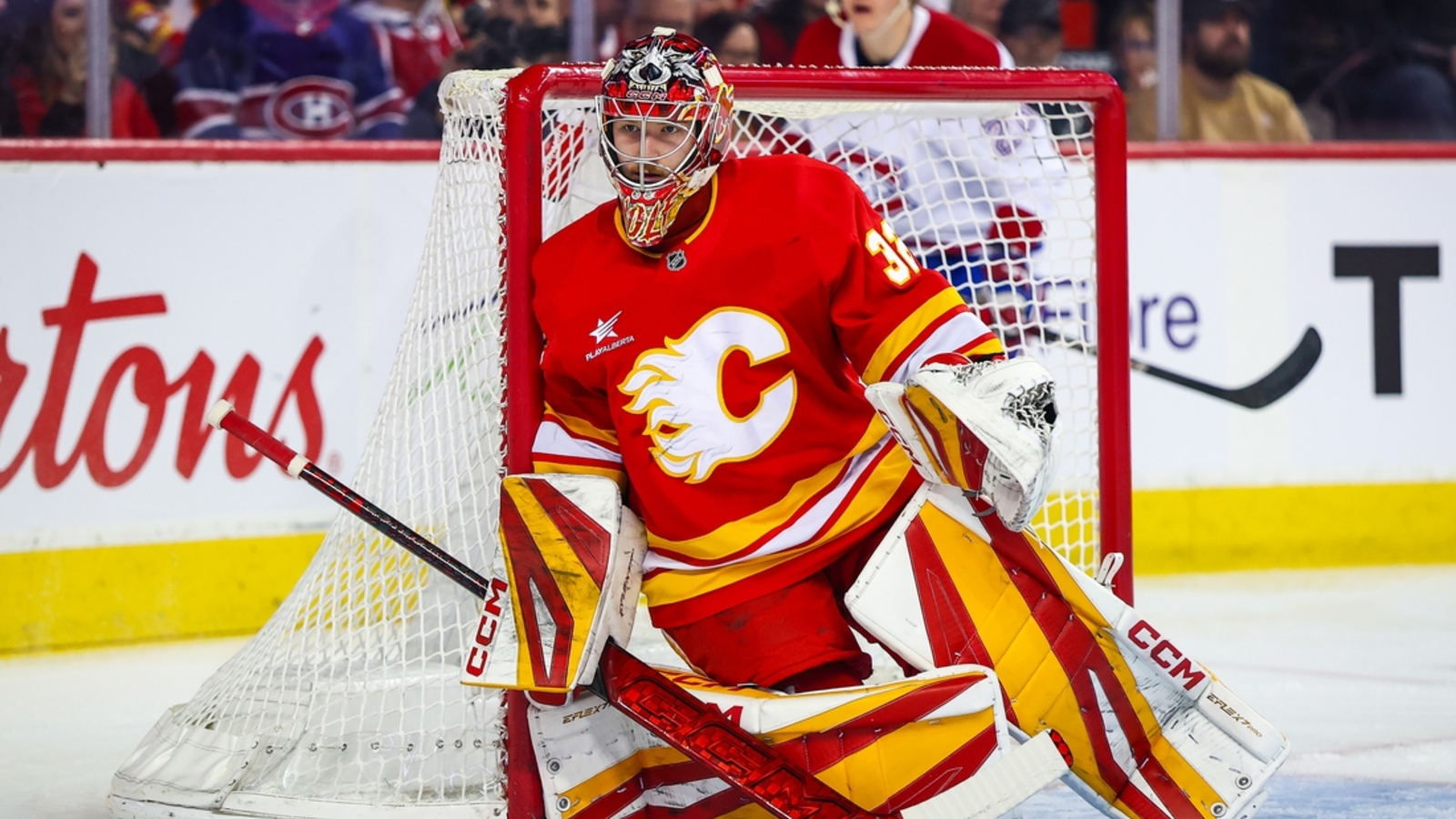 Calgary Flames goaltender Dustin Wolf (32) during an NHL game. (Jeff Roberson/AP)